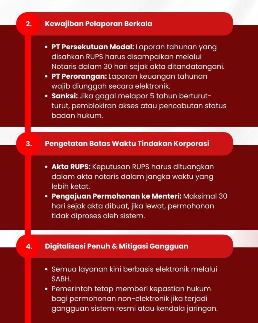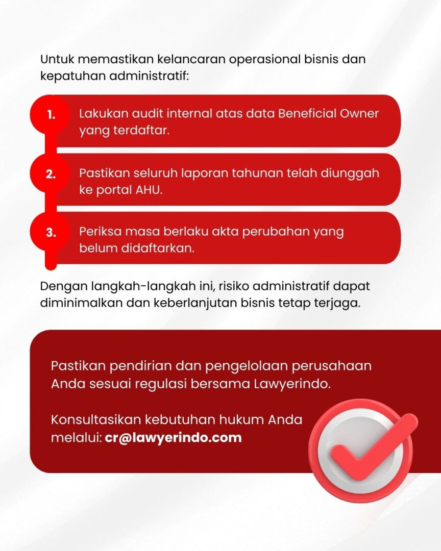 Dengan pembaruan ini, proses administrasi semakin digital & terkontrol, dokumen perusahaan lebih akurat, dan kepatuhan administratif menjadi bagian dari strategi manajemen risiko, mulai dari audit data Beneficial Owner hingga pelaporan tahunan, setiap langkah kini penting untuk menjaga kelancaran bisnis Anda.