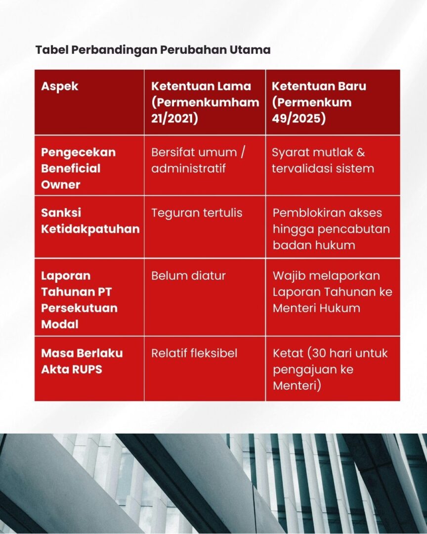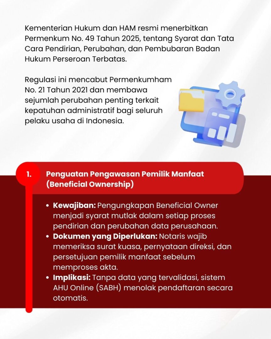 Dengan pembaruan ini, proses administrasi semakin digital & terkontrol, dokumen perusahaan lebih akurat, dan kepatuhan administratif menjadi bagian dari strategi manajemen risiko, mulai dari audit data Beneficial Owner hingga pelaporan tahunan, setiap langkah kini penting untuk menjaga kelancaran bisnis Anda.